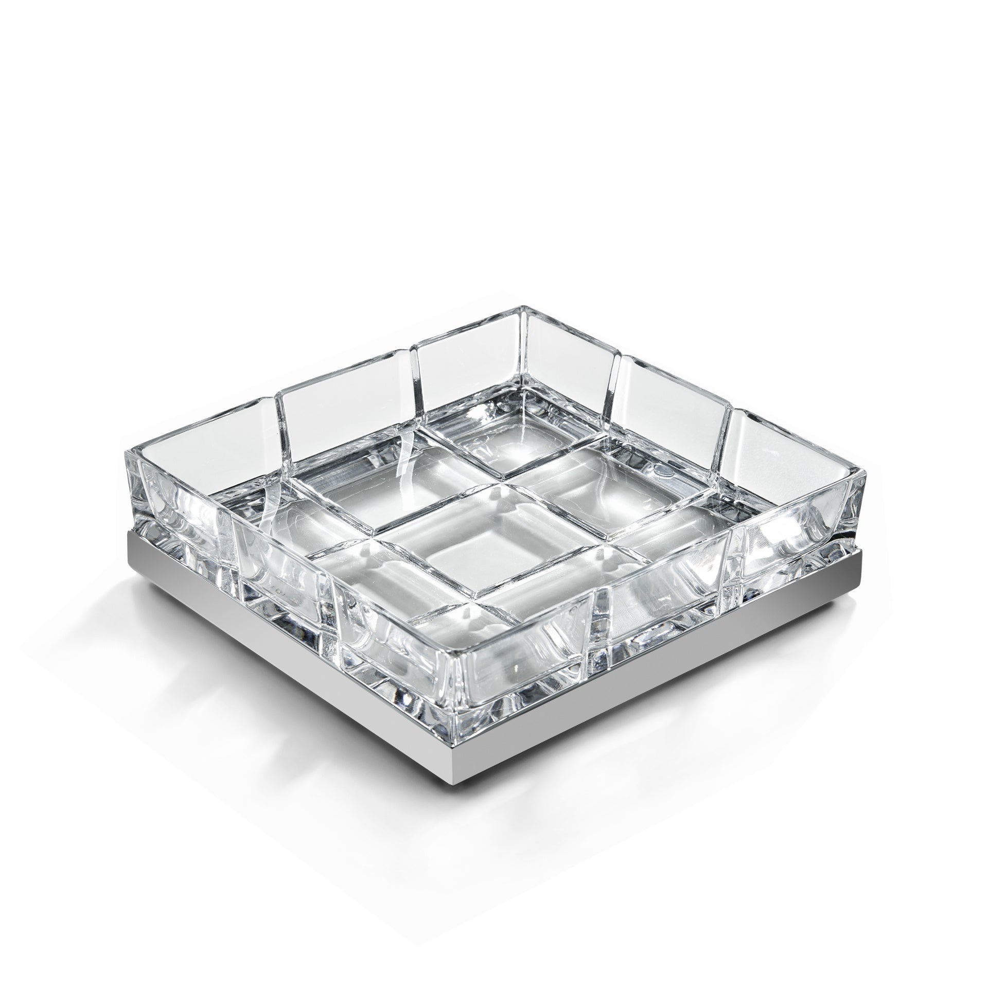 Il Cristallo 24% Pb di alta qualità si unisce all'ottone in questa collezione dalle linee squadrate, con incisioni geometriche che ricordano lo stile classico/moderno di Mies van der Rohe. Oggetti comodi, molto capienti, che non occupano spazio e basta, come spesso succede, ma che lo arredano con eleganza e praticità.