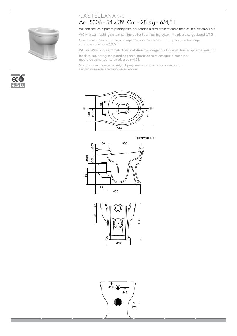 Wc Castellana in ceramica bianca con scarico a parete predisposto per scarico a terra tramite curva tecnica in plastica 6/4,5 lt. Lato parete non smaltato.