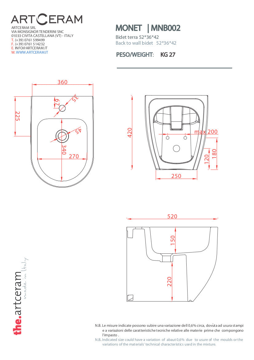 Bidet terra filomuro 1 foro + kit di fi ssaggio. Rubinetteria e accessori esclusi.