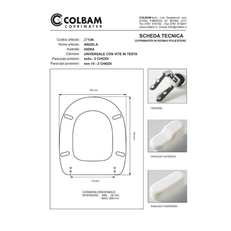 Copriwater bianco in resina poliestere per serie Angela azienda Hidra, lunghezza 40 cm, larghezza 34.3 cm, interasse min. 9.2 cm - max 20 cm