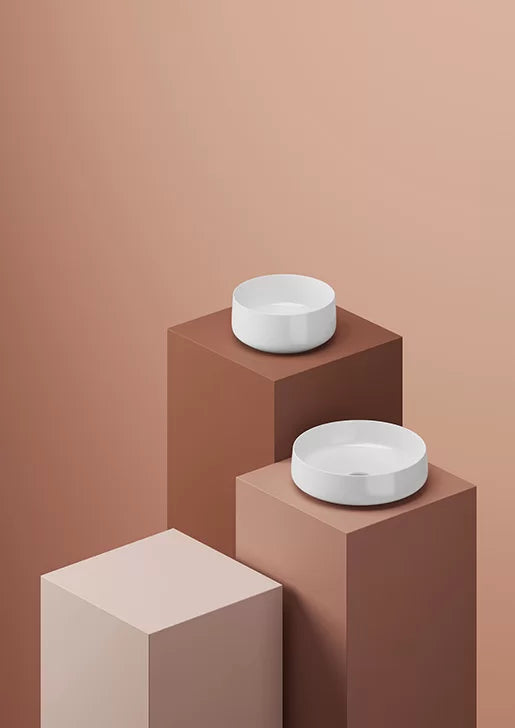 Lavabo da appoggio in ceramica della collezione COGNAC con dimensioni Ø48, nelle finiture marmoree. Piletta in ceramica up&down inclusa nel prezzo