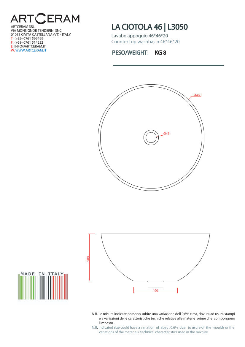 Lavabo da appoggio in ceramica, senza foro rubinetto né troppo pieno, disponibile in due dimensioni e forme diverse: tondo cm 46 e ovale cm 70x44. Piletta e accessori esclusi.
