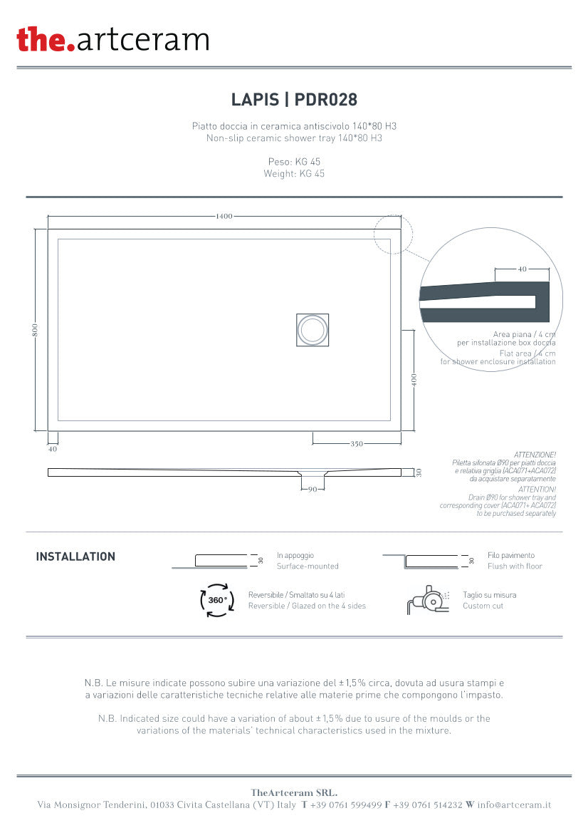 Piatto doccia in ceramica antiscivolo, piletta non inclusa