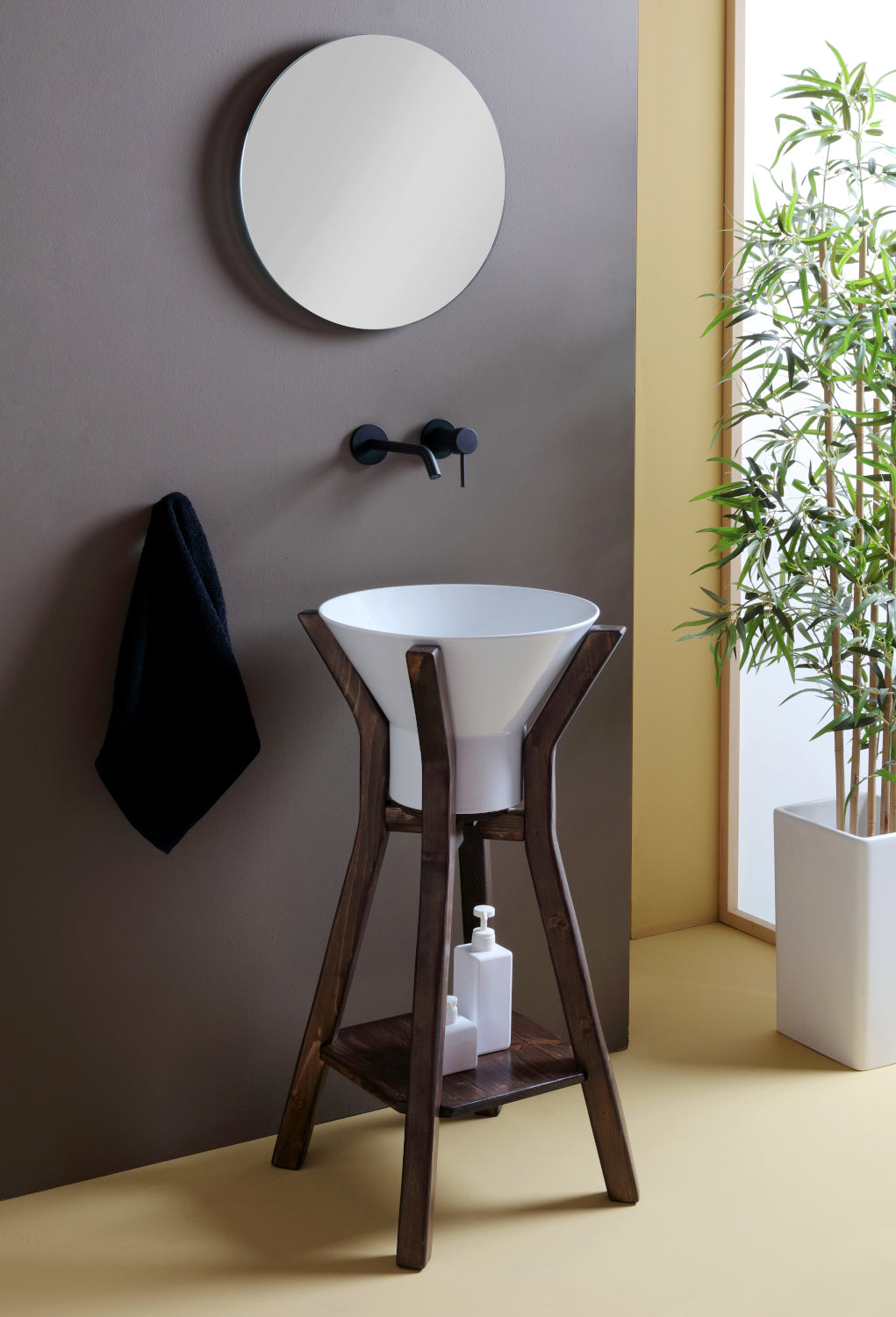 Struttura in legno portalavabo, a terra, con o senza ripiano, disponibile in 3 finiture, per lavabo Megafono