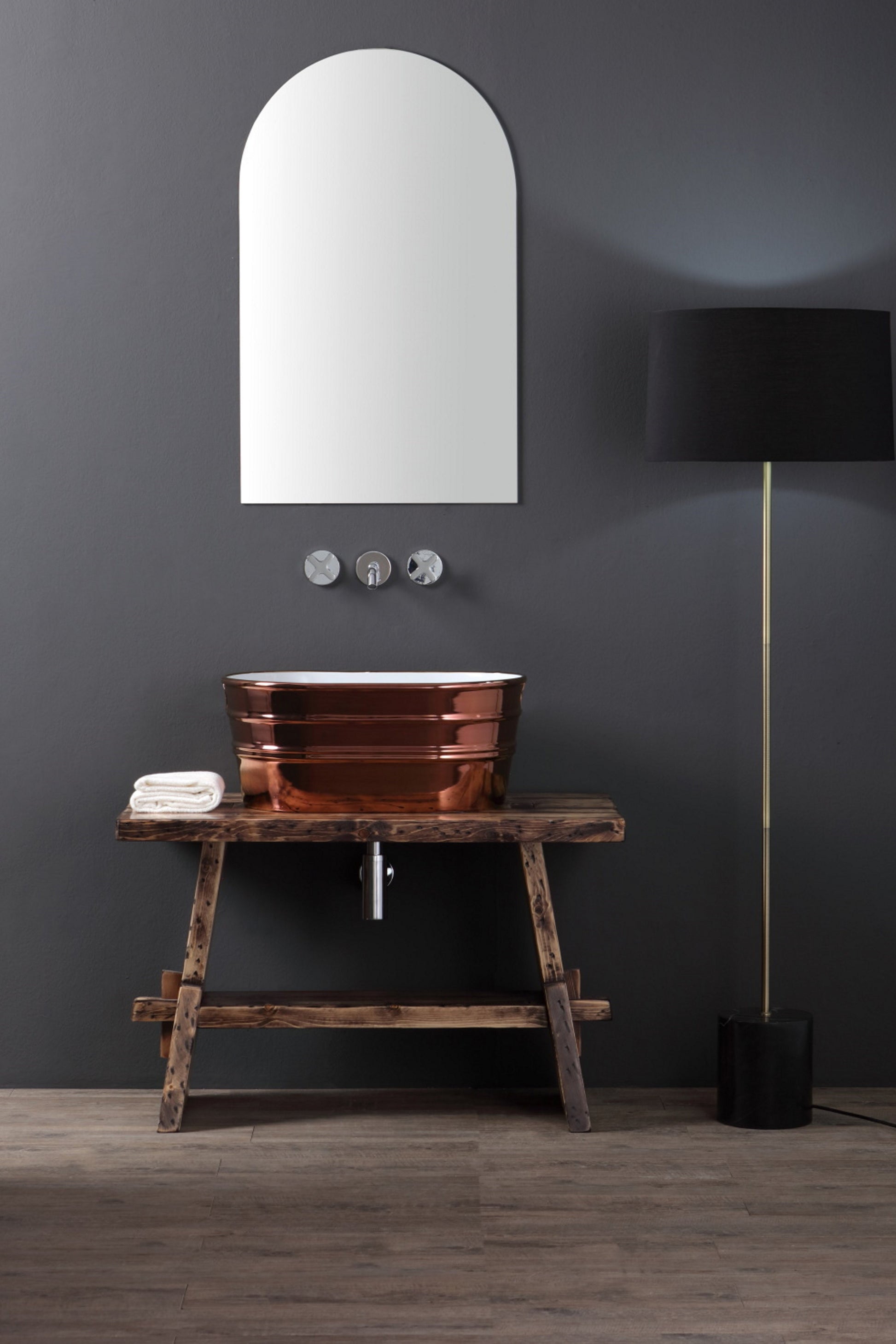 Lavabo d’appoggio o sospeso in ceramica, disponibile in vari colori. Dimensioni: mm 600 x 400 x h250. Peso netto 15 kg.