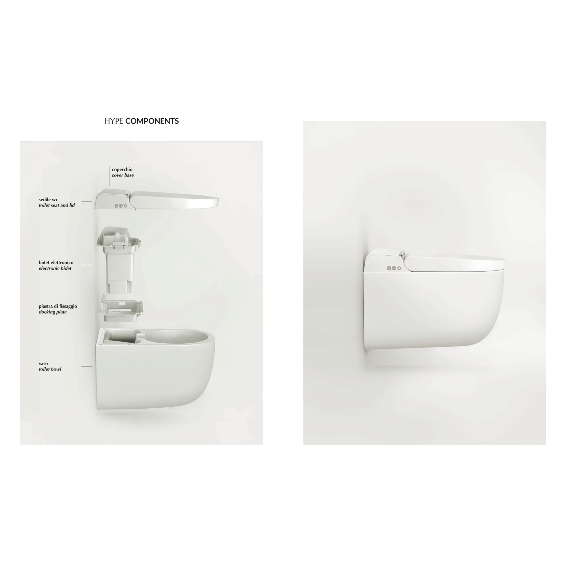 Vaso sospeso in ceramica Senza Brida multi-funzione della collezione HYPE, con modulo bidet elettronico e telecomando, delle dimensioni di 38 x 59.